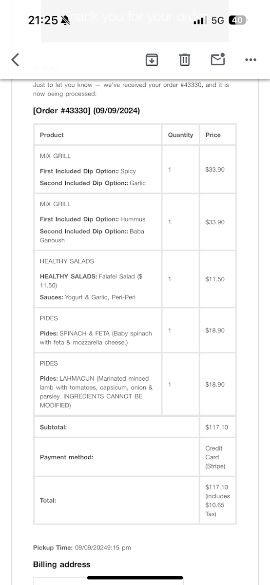 Pizzas on the menu combine Mediterranean influences and international flavors, with choices such as special pizzas featuring kebab meats (e.g., HSP Special Pizza), garlic prawn pizza, and a Mexican pizza.